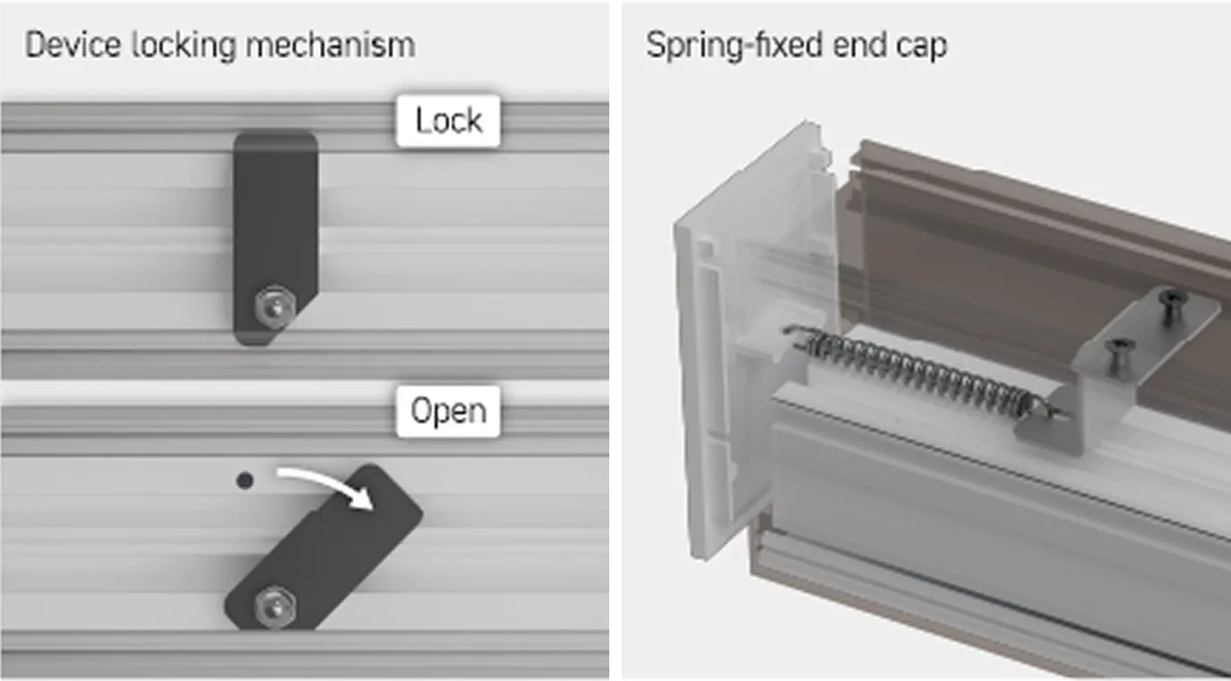 Power device can be taken out from bottom of fixtures, Hence maintenance can be completed as installed. - Spring-fixed end caps eliminate light leakage and reduce misalignment.