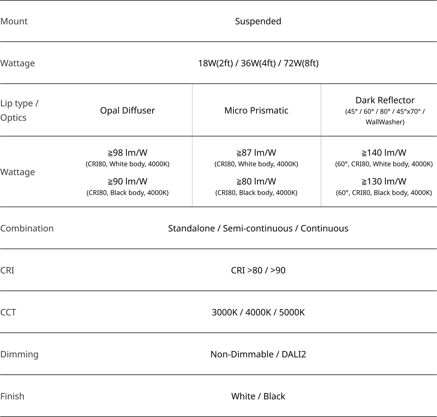 | Lip type / Optics | Opal Diffuser | Micro Prismatic | Dark Reflector (45° / 60° / 80° / 45°x70° / WallWasher) |