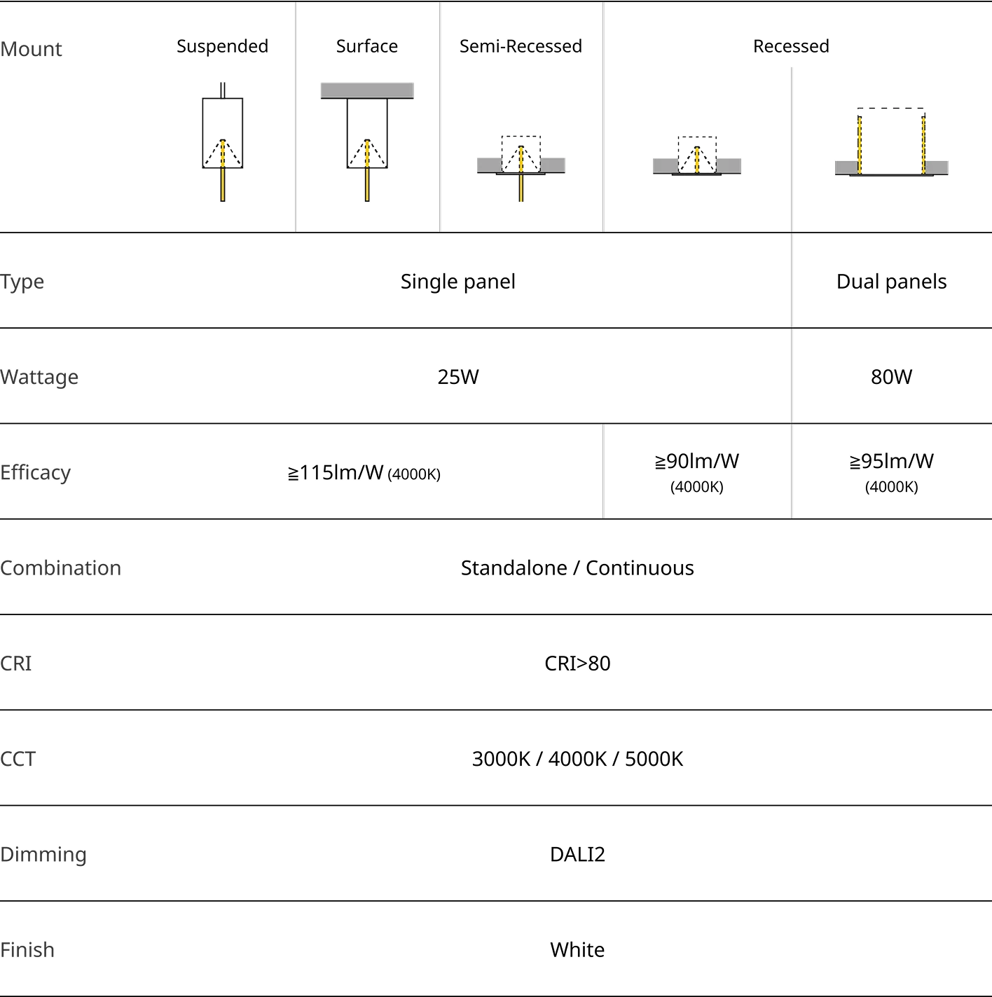 - Single panel (Suspended / Surface / Semi-Recessed / Recessed)
