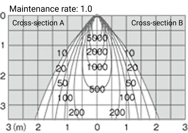 Left: The direct vertical illuminance from the center of the beam at a point on a 35-degree angle from directly below the fixture when it is facing downwards is shown. The horizontal axis represents the distance from the lighting fixture in the horizontal direction, and the vertical axis represents the height from the fixture.