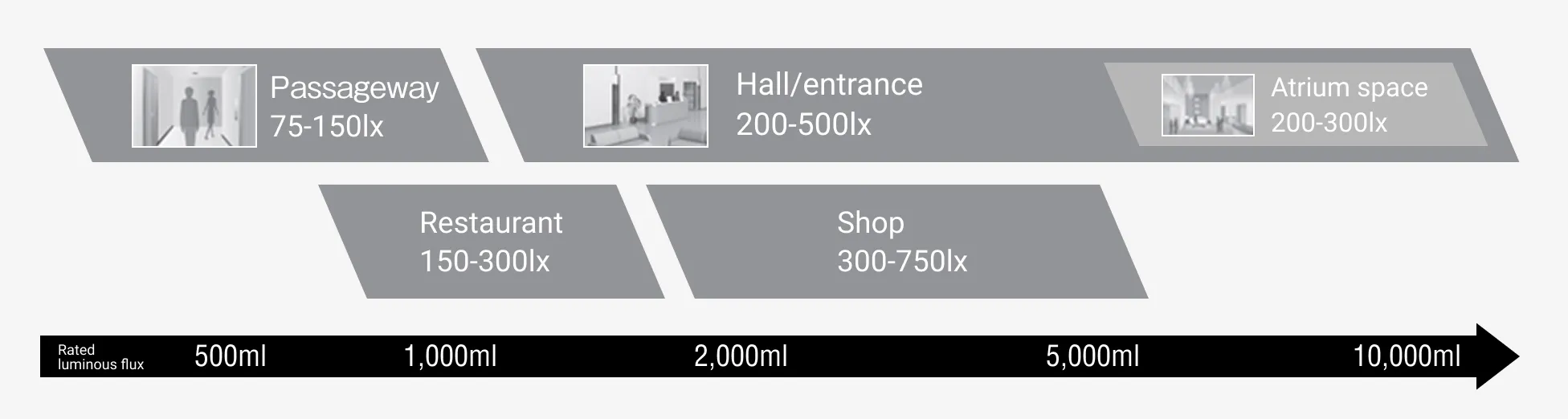 There are huge differences in the amount of light provided, even among fixtures with the same power, depending on the light distribution. Diffuse light distribution produces a uniform light that illuminates the entire space. In contrast, narrow-angle light distribution produces light with more contrast and with higher brightness in the center of the space.