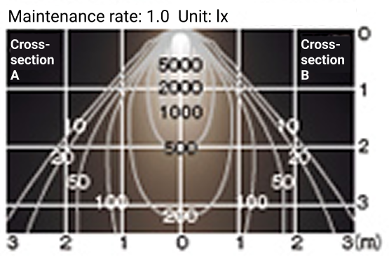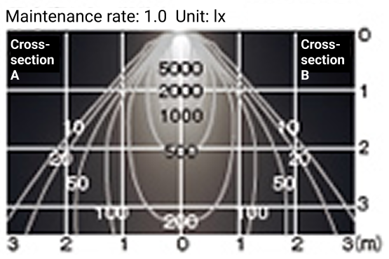 Left: The direct vertical illuminance from the center of the beam at a point on a 35-degree angle from directly below the fixture when it is facing downwards is shown. The horizontal axis represents the distance from the lighting fixture in the horizontal direction, and the vertical axis represents the height from the fixture.