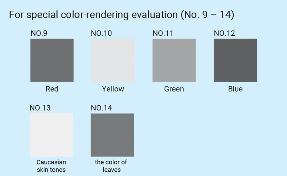 The other seven test colors comprise color charts that are used when finding the special color rendering index Ri (i=9–14): a representative color chart comprising extremely vivid reds, yellows, greens, and blues (No. 9 to No.12); a color chart for Caucasian skin tones (No.13), and a color chart of greens close to the color of leaves (No.14). The special color rendering index Ri expresses the extent of the color shift for each of the individual test colors (ΔEi;i = 9 – 14) and is calculated using the following formula.