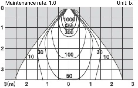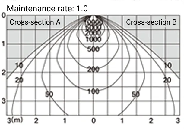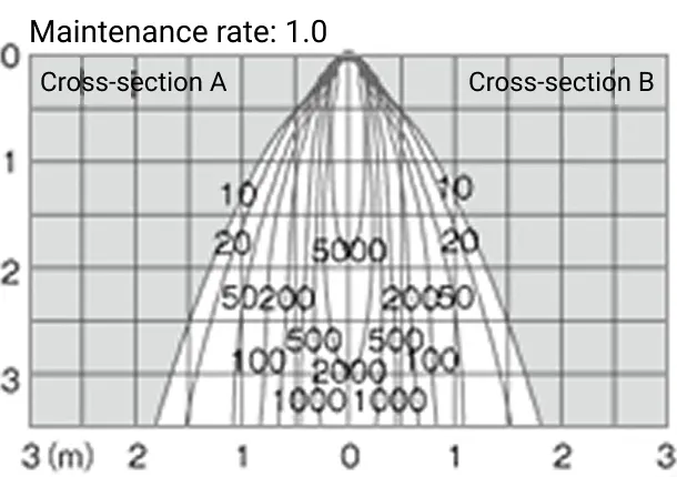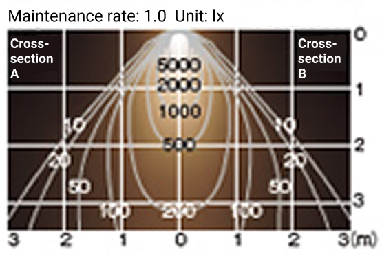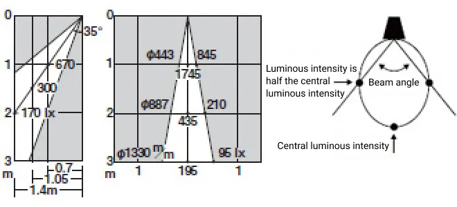 Left: The direct vertical illuminance from the center of the beam at a point on a 35-degree angle from directly below the fixture when it is facing downwards is shown. The horizontal axis represents the distance from the lighting fixture in the horizontal direction, and the vertical axis represents the height from the fixture.