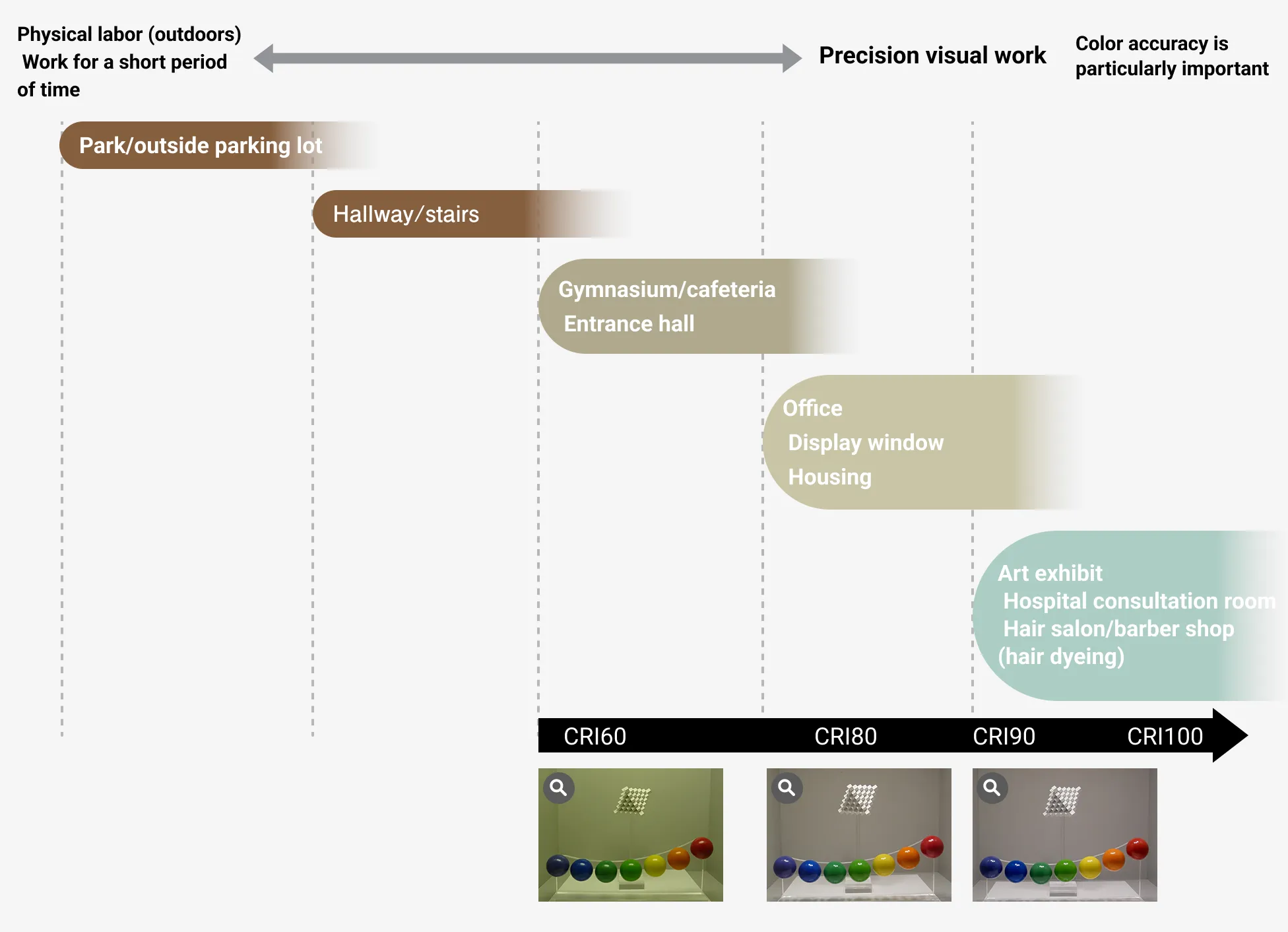 With LED lighting, there is a wide range of color rendering fixtures to choose from, and so it is necessary to consider what kind of color rendering is appropriate for the field of use and purpose of the lighting. Under ISO/CIE 8995-1, the average color rendering index (CRI) required for each work task is regulated. The higher the CRI value, the closer to natural light the colors appear.