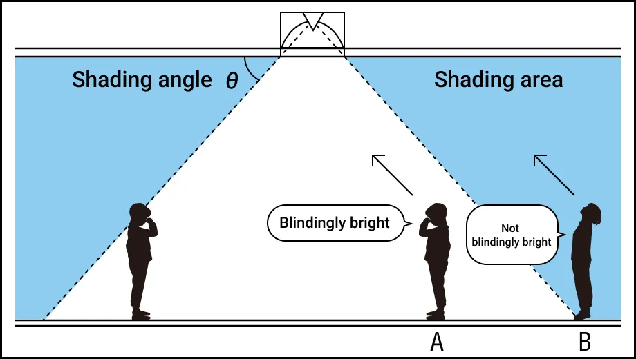 The shading angle is the angle between the limit line at which light from the lighting fixture's lamp does not shine into the eyes and the horizontal line of the lighting fixture. The greater the shading angle, the more difficult it will be for people to see the lamp, even if they get close to the lighting fixture, thereby reducing glare. However, because light is blocked, the efficiency of the lighting tends to decrease. Taking this into consideration, a shading angle appropriate for the size and purpose of the space is set.