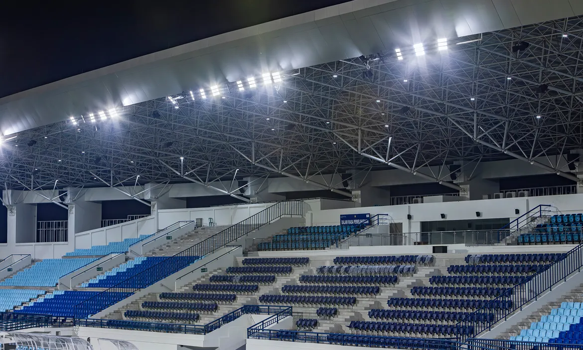 Di luar area lapangan, 63 armatur high-bay menerangi tribun penonton, memperkuat keterlibatan antara penonton dan jalannya pertandingan.