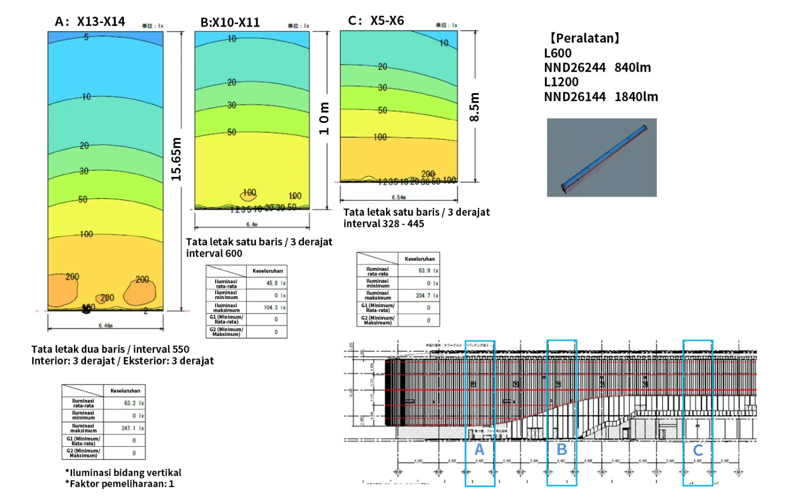 Ketinggian antara posisi peralatan pencahayaan dan plafon berbeda-beda tergantung pada lokasi di dalam struktur, sehingga iluminasi dari setiap posisi perlu diverifikasi. Berdasarkan hasil verifikasi tersebut, dirancang efek pencahayaan menggunakan simulasi pencahayaan real time. Sebaran cahayanya disesuaikan dengan karakter eksterior yang tinggi, dan fasad diterangi menggunakan pencahayaan Archiline yang mampu menghasilkan warna yang menyatu secara indah dan merata.