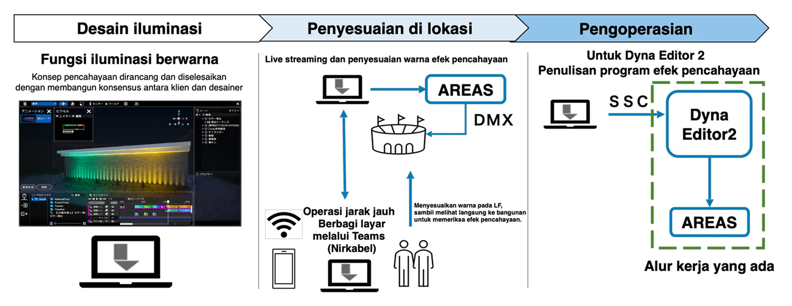 Dengan menggunakan simulasi pencahayaan real time, desain pencahayaan diselesaikan dan diverifikasi di lokasi melalui pemutaran langsung, sambil mengamati efeknya pada bangunan. Penyesuaian akhir pada warna dan waktu pencahayaan dilakukan secara real time. Koreksi dan penyesuaian yang biasanya dilakukan belakangan (memakan waktu beberapa hari hingga beberapa minggu), dapat diselesaikan di lokasi pada hari itu juga dalam waktu kurang dari satu jam. Sistem ini juga memudahkan untuk membandingkan perubahan sebelum dan sesudah penyesuaian.