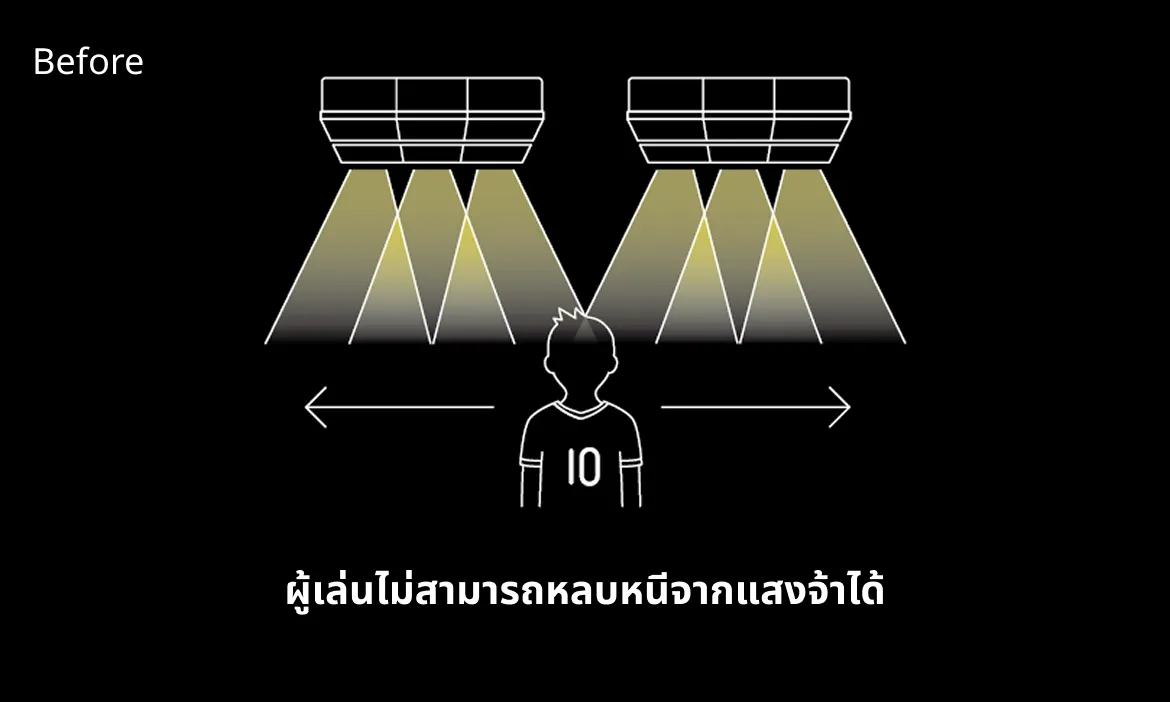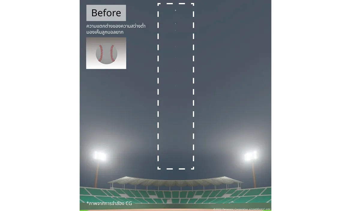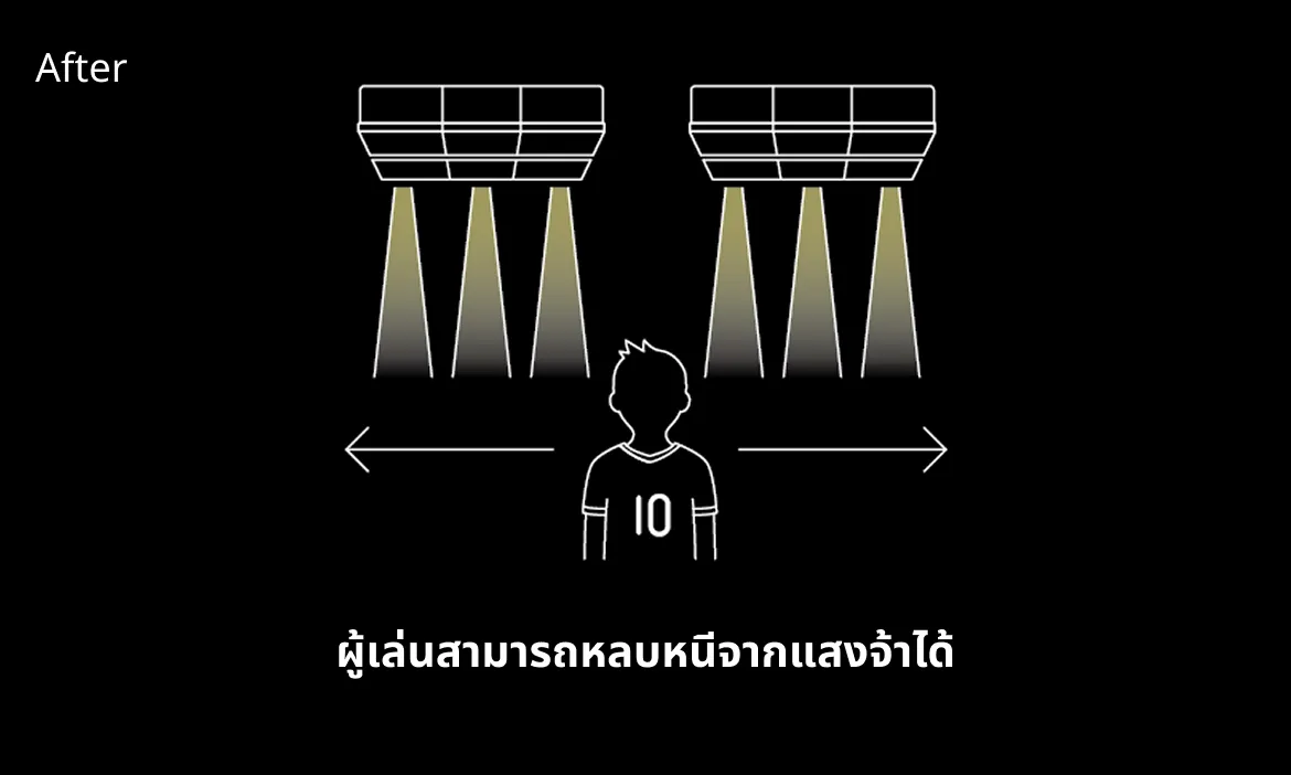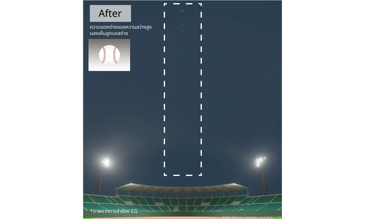 เพื่อลดแสงจ้าตอนที่มองไปที่เสาไฟโดยตรง จะต้องไม่ให้มีแหล่งกำเนิดแสงความเข้มสูงอยู่รวมกัน พานาโซนิคจึงสร้างไฟฟลัดไลท์ LED ที่มีการกระจายแสงในมุมแคบด้วยเทคโนโลยีการกระจายแสงแบบเฉพาะของเรา นอกจากนี้ อุปกรณ์ไฟส่องสว่างของ WINK Ballpark ทั้งหมดยังมีช่องตัดเพื่อลดการซ้อนทับของแหล่งกำเนิดแสงจ้าที่ไม่จำเป็น โดยลดมุมการกระจายแสงให้แคบลงอีก จึงช่วยลดแสงจ้าที่เกิดขึ้นเมื่อมองเสาไฟโดยตรง ทำให้ได้สภาพแวดล้อมการมองเห็นที่สะดวกสบายซึ่งลดผลกระทบของแสงต่อการแข่งขันกีฬา ผู้เล่นเบสบอลสามารถเล่นภายในสนามได้โดยไม่ได้รับผลกระทบจากแสงจ้า แม้ในการแข่งขันตอนกลางคืน