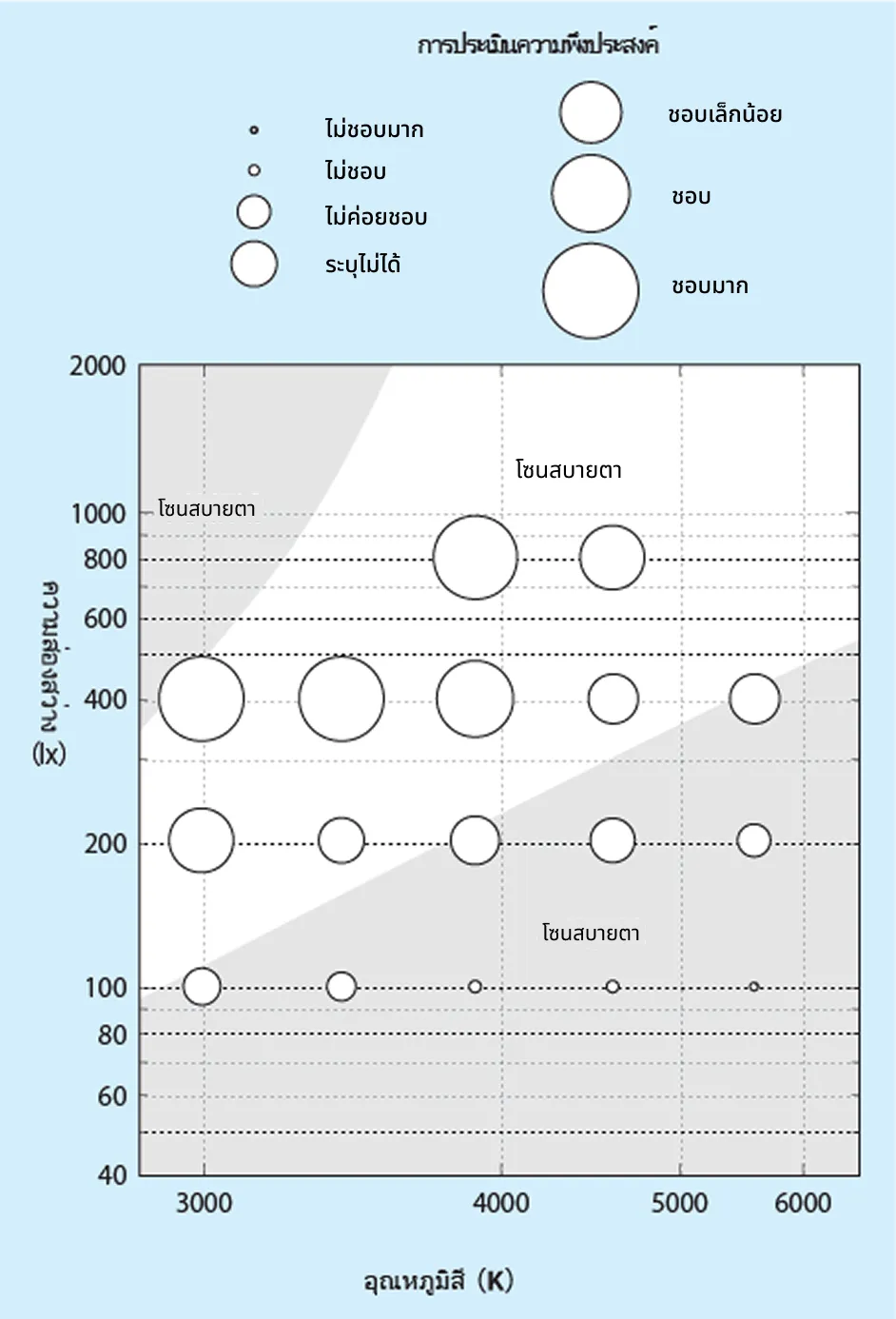 รูปที่ 1 และ 2 แสดงผลลัพธ์ของการทดลองนี้เมื่อเปรียบเทียบกับผลลัพธ์ของ Kruithof โดยยิ่งวงกลมมีขนาดใหญ่เท่าไรแปลว่าฉากดังกล่าวดูพึงประสงค์มากเท่านั้น พื้นที่ที่ดูเด่นกว่าเป็นโซนสบายตาของ Kruithof ในขณะที่พื้นที่แรเงาด้านล่างแสดงถึงโซนไม่สบายตา ในการประเมิน “การเข้าสังคม” ที่แสดงในรูปที่ 1 ขนาดของวงกลมจะเล็กเมื่อความส่องสว่างอยู่ที่ 100 lx และจะมีขนาดใหญ่เมื่อความส่องสว่างอยู่ที่ 400 lx ภายในโซนสบายตาของ Kruithof ระดับความพึงประสงค์โดยทั่วไปคือ “ระบุไม่ได้” หรือสูงกว่า ในขณะที่ภายในโซนไม่สบายตามีระดับความพึงประสงค์คือ “ระบุไม่ได้” หรือต่ำกว่า ทำให้เห็นว่าผลการประเมินคล้ายคลึงกับผลการประเมินของ Kruithof