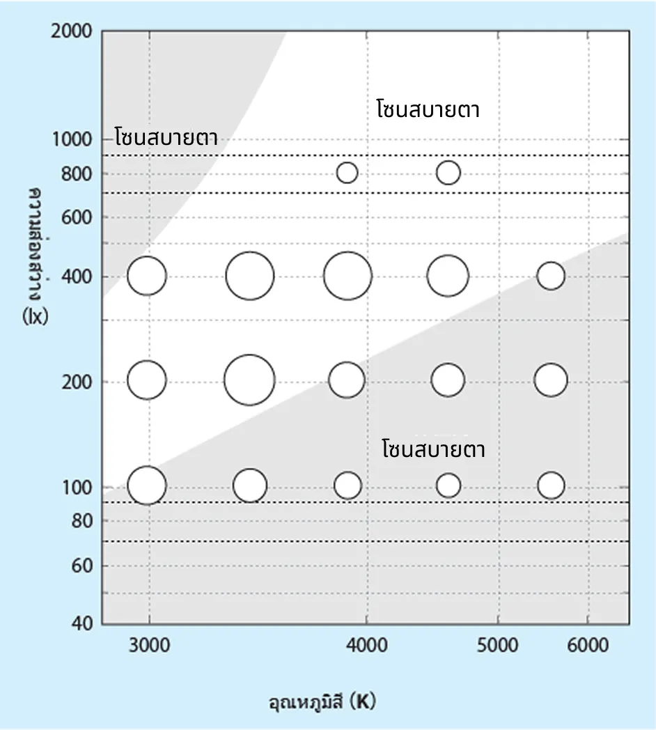 6) Kanaya, S. และ Kichise, H.: ผลกระทบของอุณหภูมิสี/คุณสมบัติความถูกต้องของสีของแหล่งกำเนิดแสงต่อความส่องสว่างที่ต้องการ รายงานการประชุมประจำปีของสถาบันวิศวกรรมแสงสว่างแห่งประเทศญี่ปุ่น (1975) หน้า 48