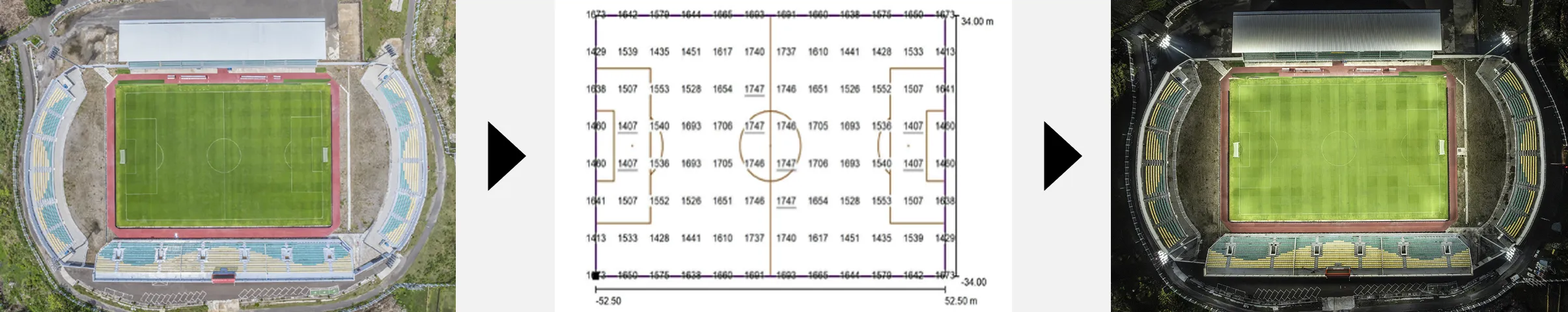 Để đáp ứng các khuyến nghị của FIFA, các tính toán chiếu sáng dựa trên mô phỏng đã được thực hiện để đạt được độ rọi theo phương ngang trung bình là 1.500 lx. Thiết kế này ưu tiên phân bố ánh sáng cân bằng và sự thoải mái về thị giác, vừa đảm bảo độ rọi đồng đều trên toàn sân vừa giảm hiện tượng chói lóa có thể ảnh hưởng đến quá trình thi đấu và hoạt động của trận đấu.