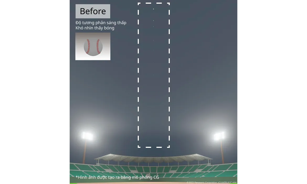 Hình ảnh CG sử dụng mô phỏng ánh sáng thời gian thực đã được tạo ra cho đề xuất này. Các mô phỏng được thực hiện nhằm đánh giá hiệu quả giảm chói khi toàn bộ đèn sân vận động được bật, cũng như lượng ánh sáng lọt ra bên ngoài sân vận động. Bên trái là hình ảnh mô phỏng tạo bằng mô phỏng ánh sáng thời gian thực, còn bên phải là ảnh chụp thực tế. Chúng tôi đã tái hiện được môi trường ánh sáng tương đương với mô phỏng và thực hiện các mô phỏng có độ chính xác cao.