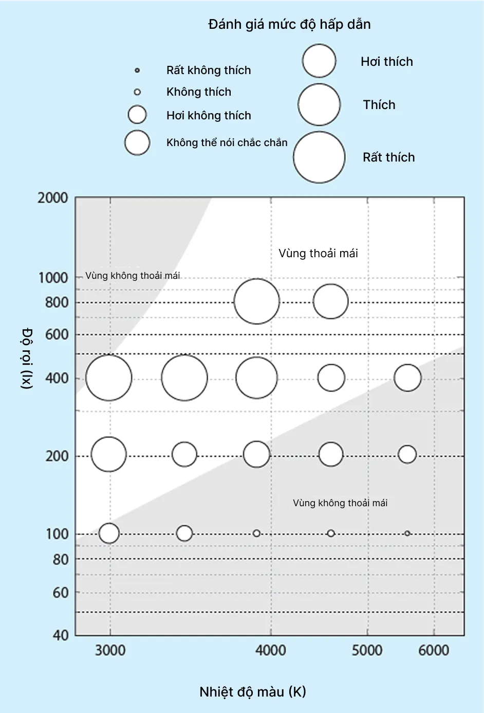 Hình 1 và 2 thể hiện kết quả của thí nghiệm này so với kết quả của Kruithof. Ở đây, vòng tròn càng lớn thì cảnh càng được cảm nhận là hấp dẫn hơn. Vùng được khoanh viền thể hiện vùng thoải mái của Kruithof, còn vùng được tô bóng bên dưới thể hiện vùng không thoải mái. Đối với đánh giá về mức độ “giao lưu” được thể hiện trong Hình 1, kích thước vòng tròn nhỏ khi độ rọi là 100 lx và lớn khi độ rọi là 400 lx. Trong vùng thoải mái của Kruithof, mức độ hấp dẫn thường là “Không thể nói chắc chắn” hoặc cao hơn; trong vùng không thoải mái, mức độ hấp dẫn là “Không thể nói chắc chắn” hoặc thấp hơn. Như vậy, kết quả đánh giá tương tự với kết quả của Kruithof.