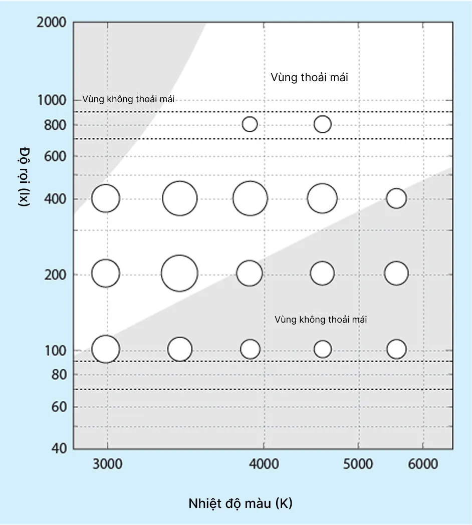 Đối với đánh giá về mức độ “thư giãn” được thể hiện trong Hình 2, sự kết hợp giữa độ rọi và nhiệt độ màu tồn tại trong vùng không thoải mái của Kruithof không phải là đặc biệt hấp dẫn. Điều này cho thấy kết quả của cả hai thí nghiệm đều tương tự nhau. Trong số các sự kết hợp giữa độ rọi và nhiệt độ màu nằm trong vùng thoải mái của Kruithof, điều kiện chiếu sáng 800 lx không phải là đặc biệt hấp dẫn. Đây là điểm duy nhất mà kết quả đánh giá tâm lý khác với kết quả của Kruithof.